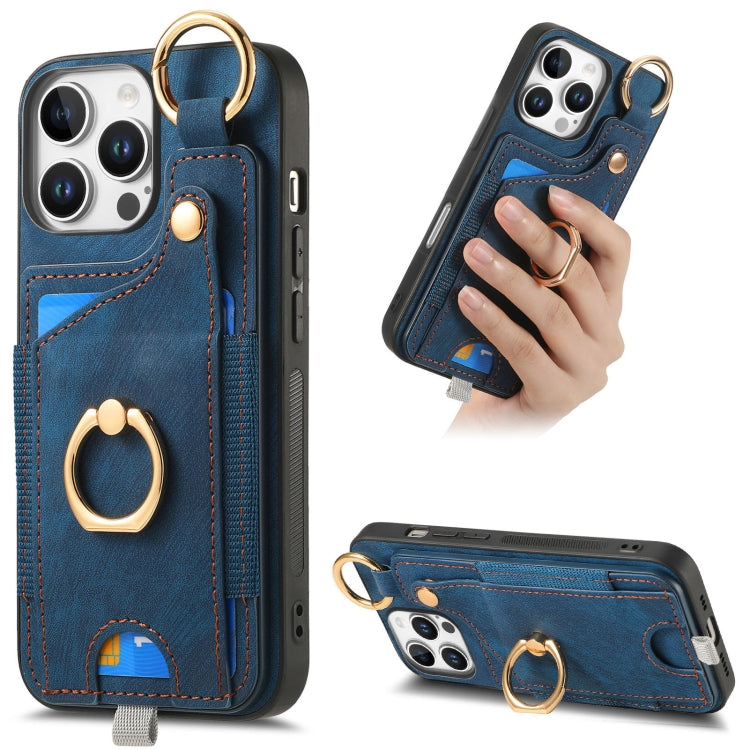Funda para Teléfono con Anillo y Tarjetero Estilo Retro con Asa para Colgar iPhone 16 Pro Max (Azul)