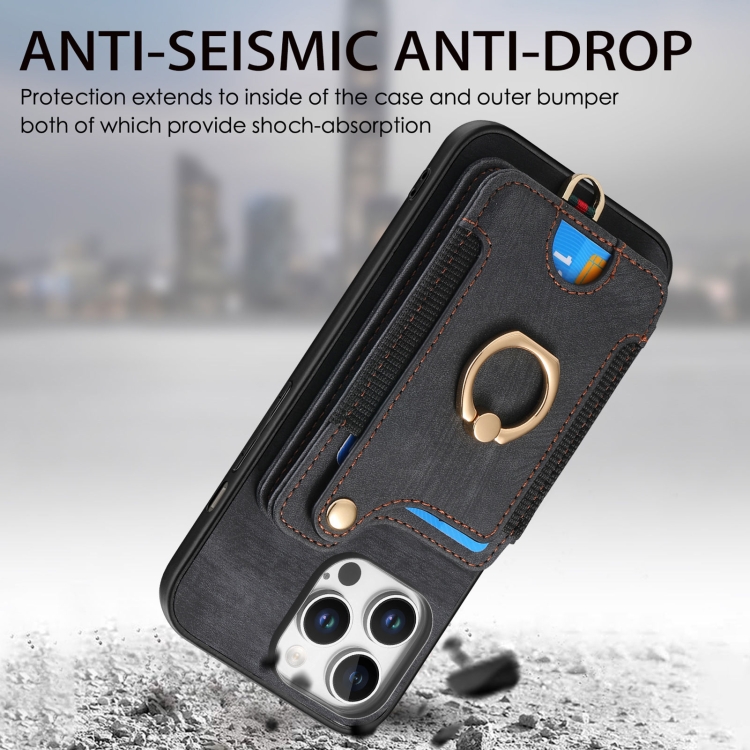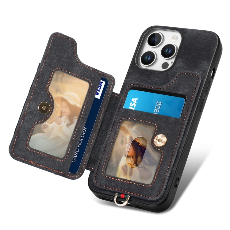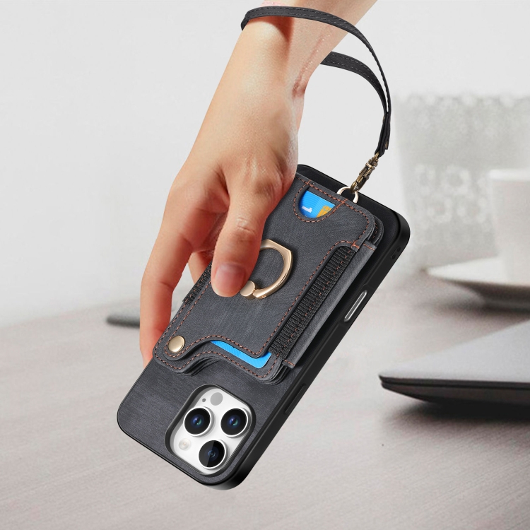 Funda para Teléfono iPhone 16 Pro Max Billetera MultiTarjeta Piel Sintética Anillo (Negra)
