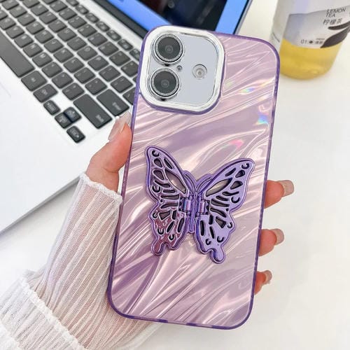 Funda para Teléfono TPU iPhone 16 Plus Soporte Mariposa Película Lente (Ondas de Agua Moradas)