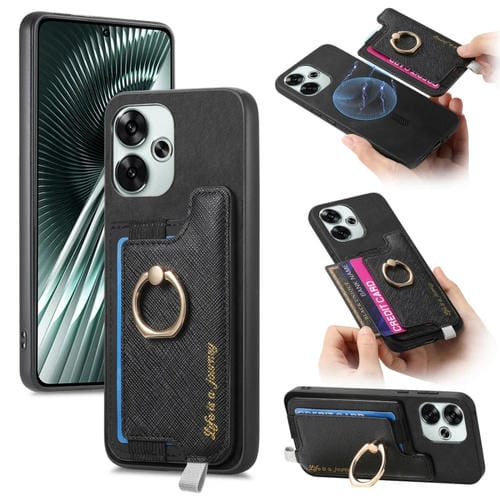 Funda para Teléfono con TaRJetero y Anillo de Cuero con Diseño Retro Magsafe Cross para Redmi Turbo 3 5G (Negro)