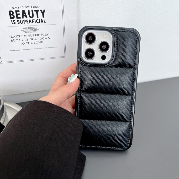Funda para Teléfono iPhone 16 Textura Fibra de Carbono y Plumón (Negra)