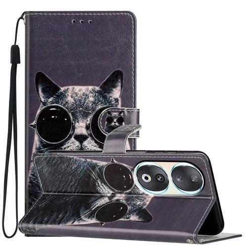 Funda de Cuero para Honor 90 con Dibujo de Gato con Gafas de Sol (Colores)