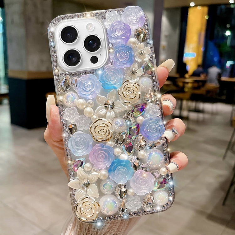 Funda para teléfono PC iPhone 16 Pro Max diseño diamantes perlados y rosas (Azul)