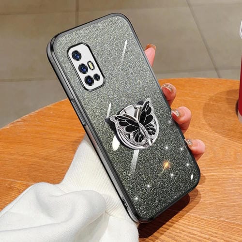 Funda para Teléfono de TPU con Soporte para Mariposas con Purpurina Degradada Chapada En Idn para Vivo V17 India/V19 (Negra)