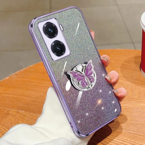 Funda para Teléfono de TPU con Soporte para Mariposas con Purpurina Degradada Chapada para Vivo Y77 5G (Morado)