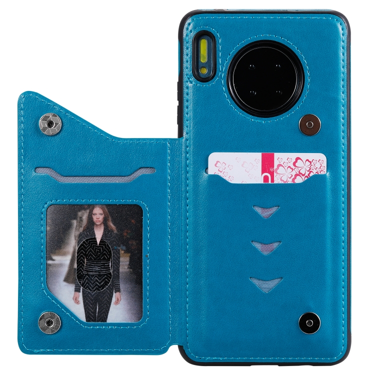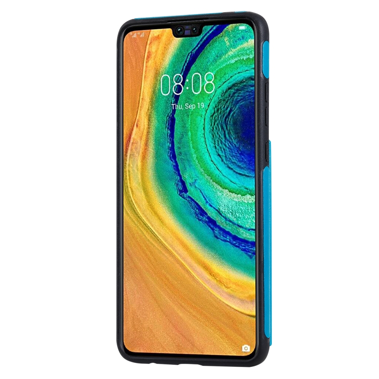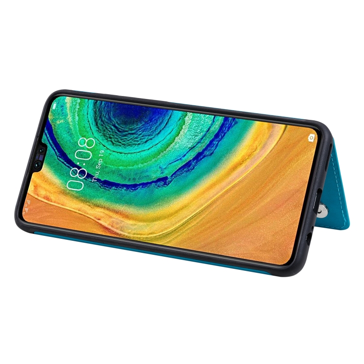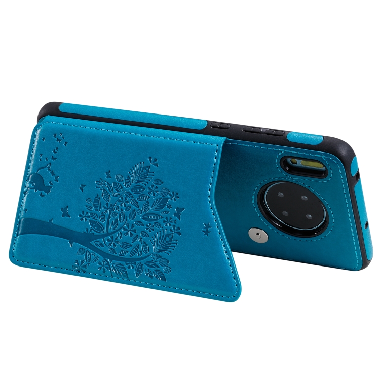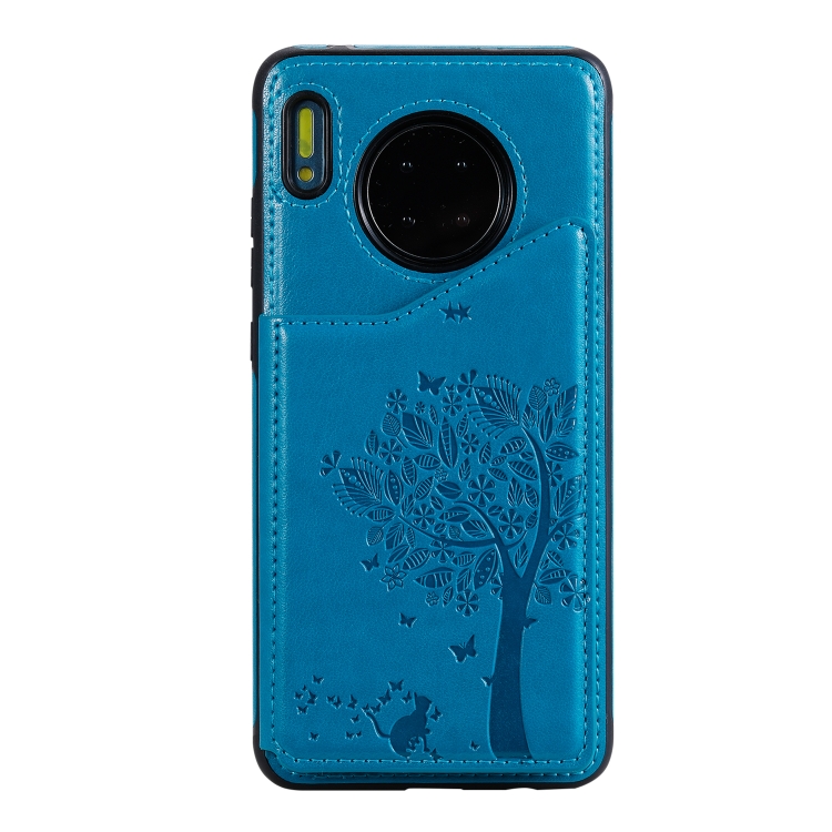 Funda protectora a prueba de golpes con patrón en relieve de árbol de gato Huawei Mate 30 con ranuras para tarjetas y marco de fotos (azul)