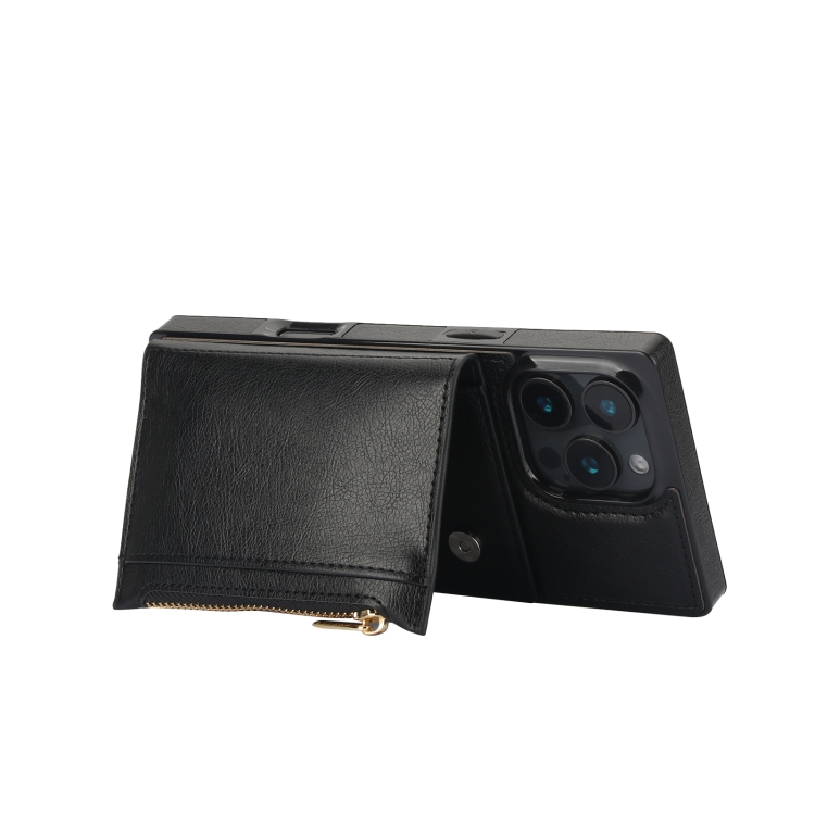 Funda Tipo Billetera con Cremallera Cuadrada para iPhone 16 Pro Carcasa Trasera de TPU y PU (Negra)