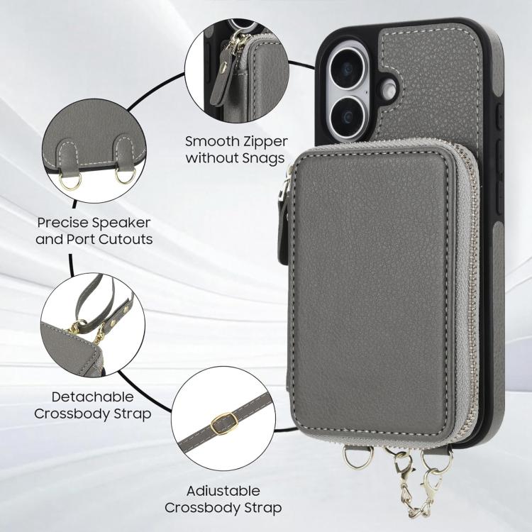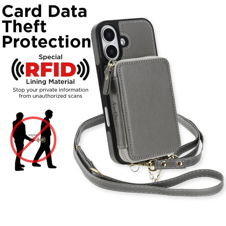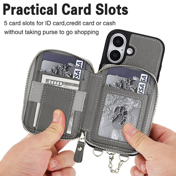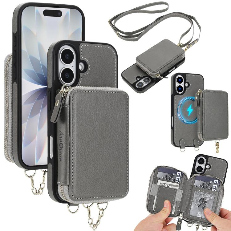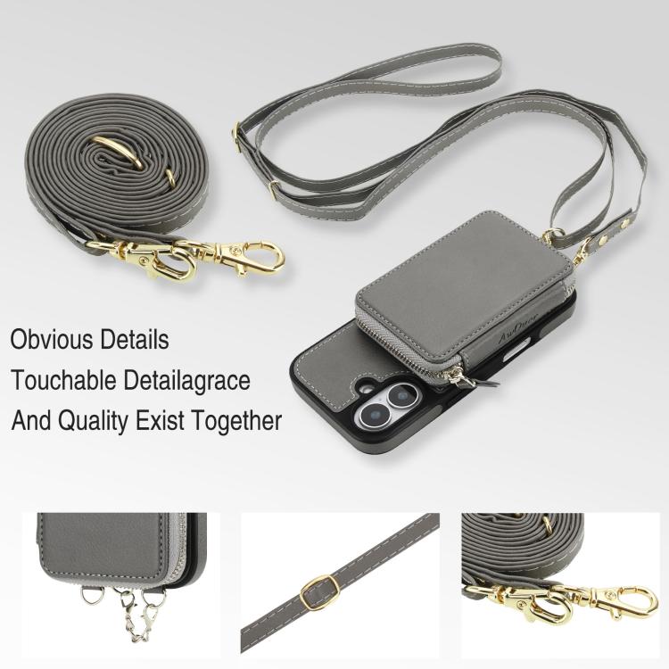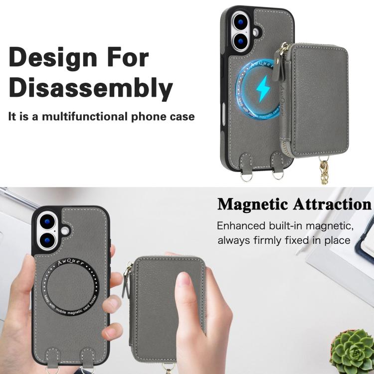 Funda tipo cartera bandolera con cremallera AwQuer 2 en 1 para iPhone 17, con parte trasera de cuero (gris).