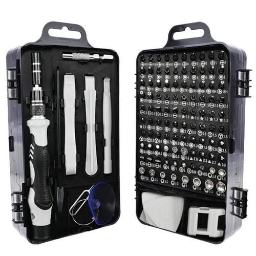 El Juego de Destornilladores 117 en 1 Movilstore es un Conjunto completo de herramientas diseñado para el desmontaje y reparación de consolas de Juegos, así como otros dispositivos electrónicos y mecánicos. Fabricado con acero de vanadio cromado, este set ofrece una amplia variedad de puntas métricas que permiten realizar tareas de precisión en Teléfonos Móviles, Cámaras Digitales, Relojes, anteojos, Computadoras Portátiles, televisores, aires acondicionados, Ventiladores, refrigeradores y autoMóviles. Su diseño compacto y ligero facilita el manejo y transporte, siendo ideal para usuarios que reparan por cuenta propia y profesionales del mantenimiento técnico.