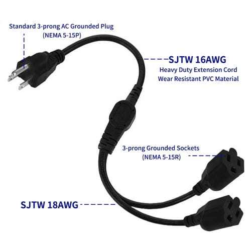 • 1x Extensor de Cable de Alimentación Junsunmay US 1.6Ft Nema 5-15P a 2 Vías Nema 5-15R SJT 16AWG 3 Clavijas