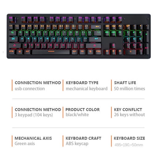 - 104 teclas con eje mecánico Green Axis, iluminación colorida, diseño ergonómico de seis filas y cuatro niveles de altura, Cable USB de 1,6 metros, vida útil de 50 millones de pulsaciones, tamaño 45x14x3 cm, peso aproximado 770 g