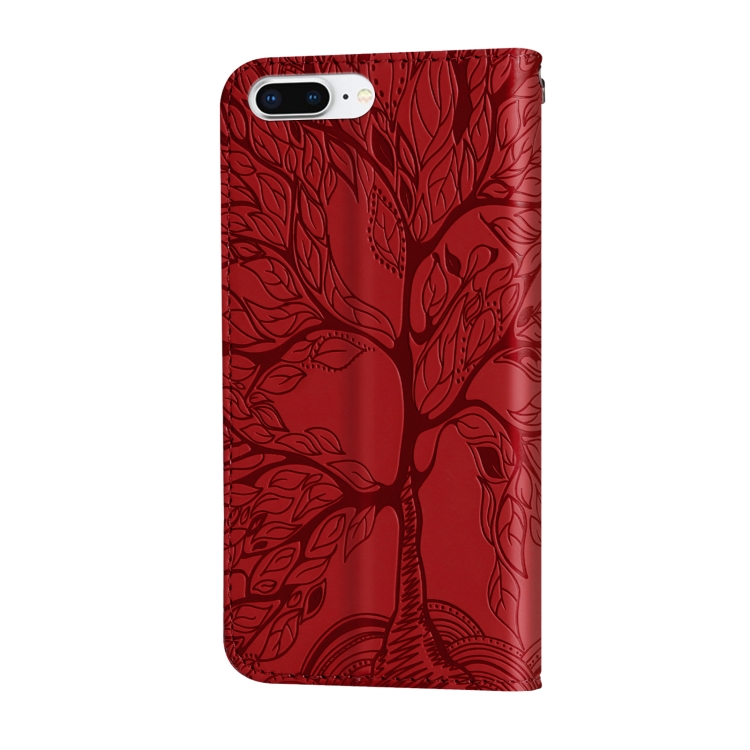 Estuche de Cuero Life Of Tree con Tapa Horizontal Patrón En Relieve Soporte Ranura para Tarjeta Billetera Marco Fotos Cordón para iPhone 8 Plus y 7 Plus (Rojo)
