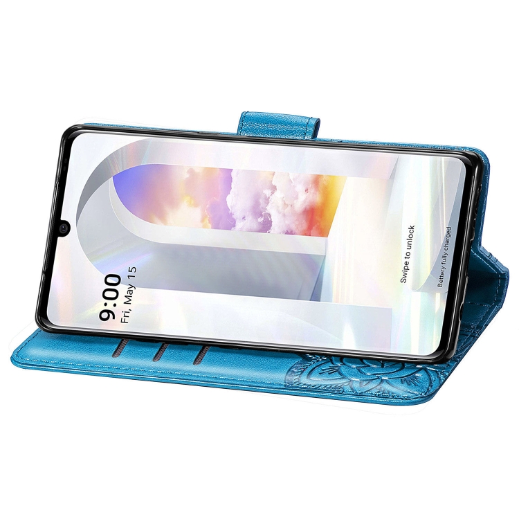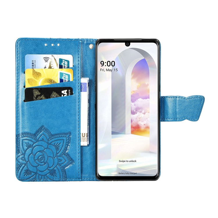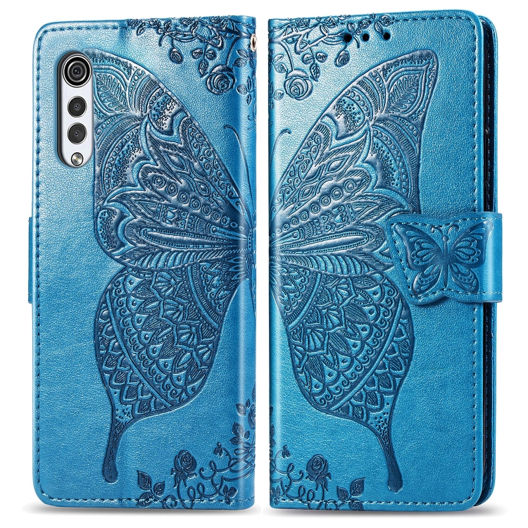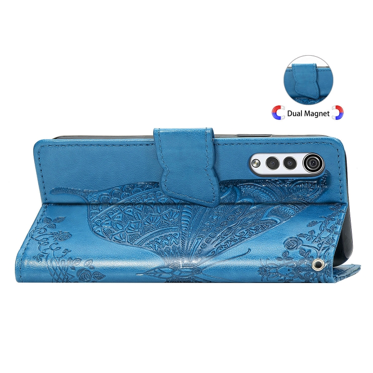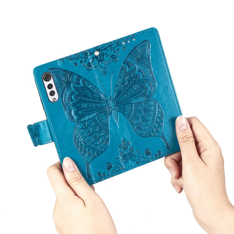 Funda Cuero LG Velvet 2 Pro Mariposa Amor Flores en Relieve con Soporte y Ranuras (Azul)