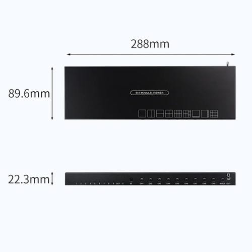 • Resolución soportada: 4K 30Hz, 1080P 60Hz, 720P 60Hz; Entrada HDMI x9; Salida HDMI x1; Ancho de Banda 60Hz; Fuente de Alimentación CC 12 V 2 A; Temperatura de trabajo entre -50 y 80 grados Celsius; Dimensiones: 288x89,6x22,3 mm; Peso: 0,67 kg