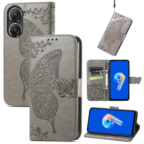 Estuche para Asus Zenfone 9 Butterfly Cuero en Relieve Love Flower (Gris)