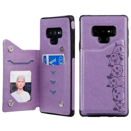 Estuche Protector Galaxy Note 9 Six Cats con Patrón En Relieve, Soporte, Ranuras para Tarjetas y Marco de Fotos (Púrpura)
