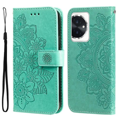 Funda para Teléfono Honor 100 de Cuero con Estampado de Flores de 7 Pétalos (Verde)