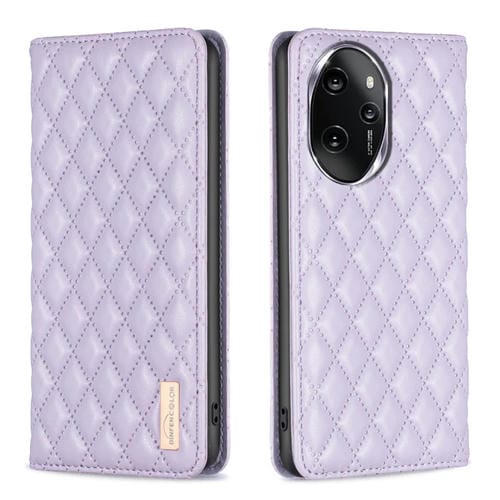 Funda para Honor 100 Pro con Tapa de Cuero Magnético y Diseño Diamond Lattice (Púrpura)
