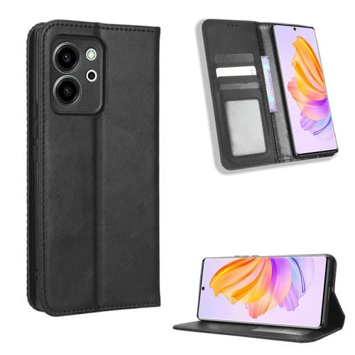 Funda de Cuero para Honor 80 Se 5G con Hebilla Magnética y Textura Retro (Negro)