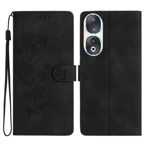 Funda de Cuero para Honor 90 con Estampado de Mariposa y Flores (Negro)