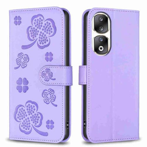 Funda de Cuero para Honor 90 Pro con Relieve de Cuatro Hojas (Púrpura)