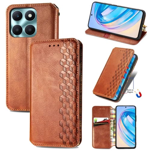Funda de Teléfono Honor X6A Cubic Grid Cuero Magnético Prensado (Marrón)