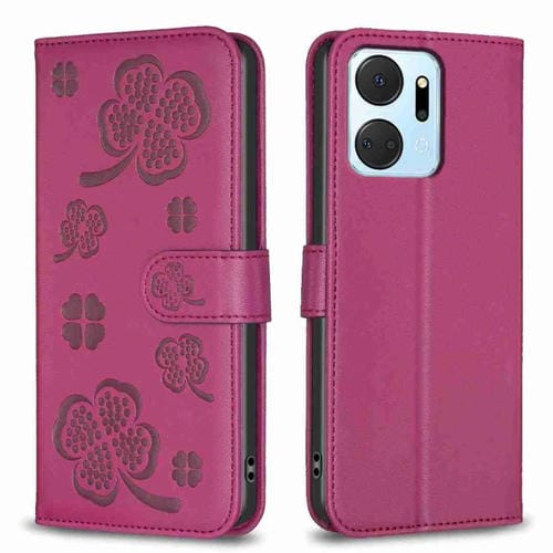 Funda para Teléfono Honor X7A Cuero con Relieve de Cuatro Hojas (Rojo Rosa)