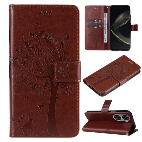 Funda para Huawei Nova 12 Se y Nova 11 Se de Cuero con Tapa y Patrón en Relieve de Árbol y Gato (Café)
