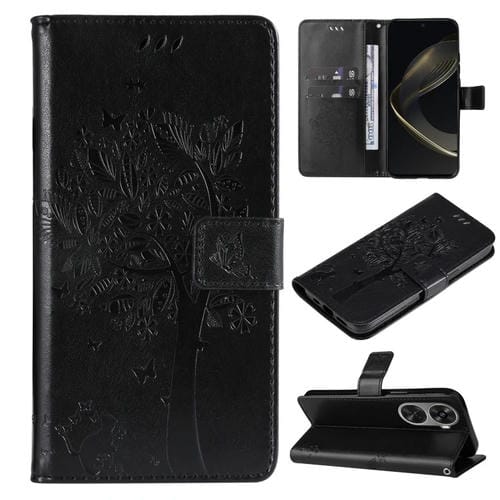 Funda para Huawei Nova 12 Se y Nova 11 Se de Cuero con Tapa y Patrón en Relieve Árbol y Gato (Negro)