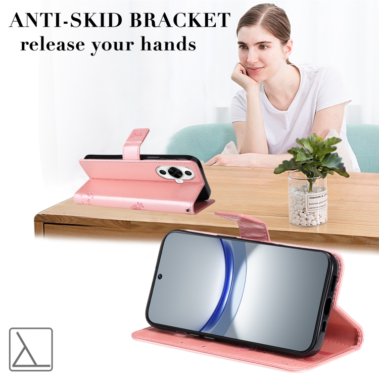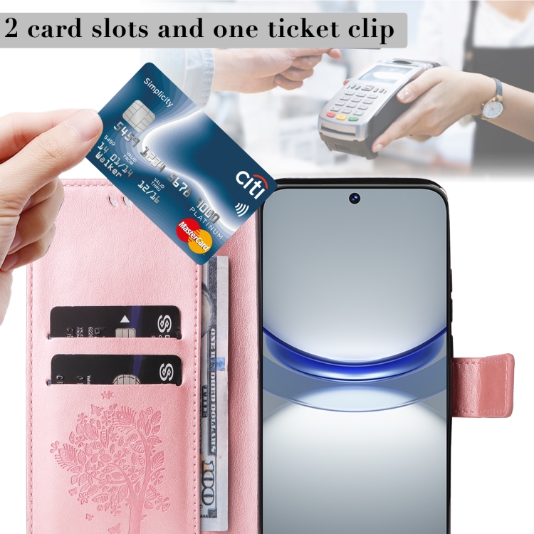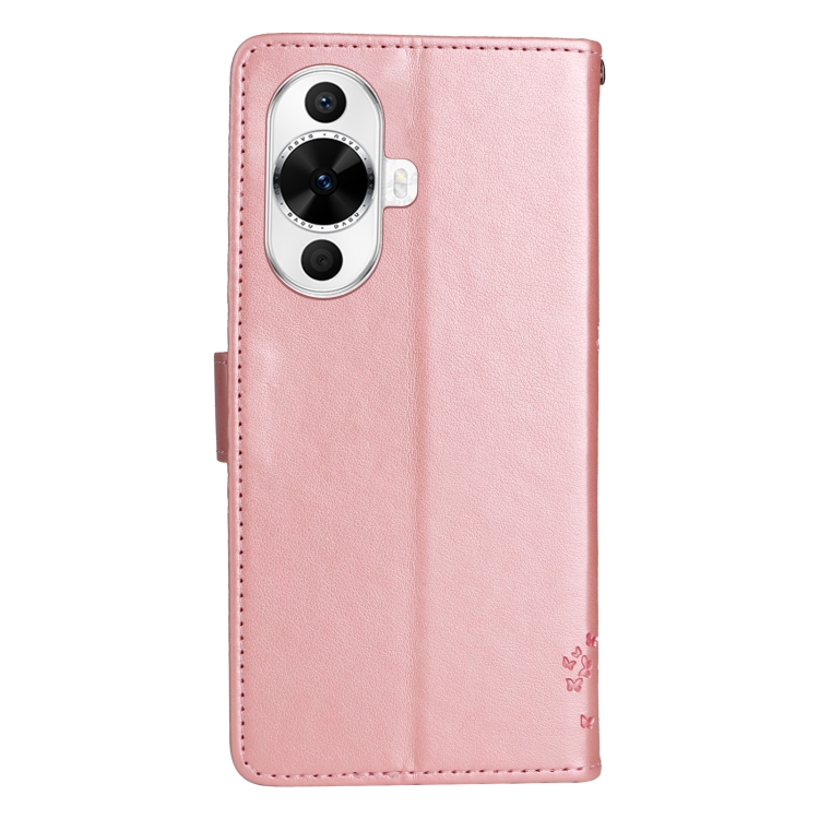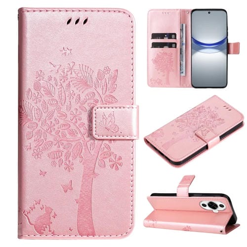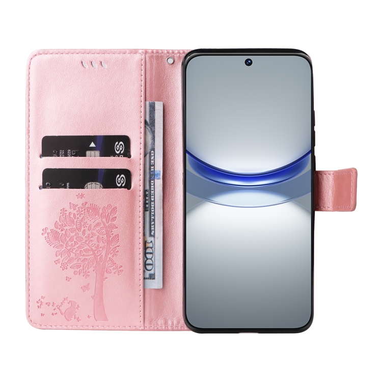 Funda para Huawei Nova 12S de Cuero con Tapa y Patrón en Relieve Árbol y Gato (Oro Rosa)