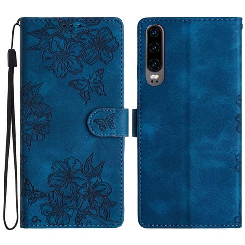 Funda para Huawei P30 Cherry Blossom Butterfly Skin Feel de PU en Relieve (Azul)