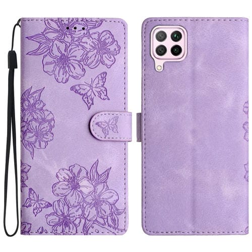 Funda para Huawei P40 Lite Cherry Blossom Butterfly Skin Feel de PU en Relieve (Púrpura)