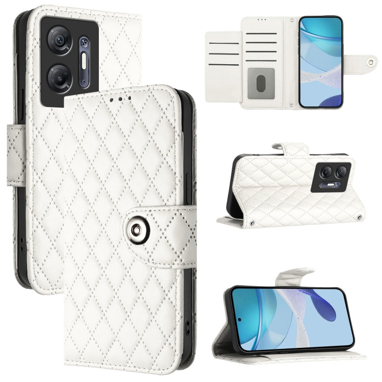 Funda de Cuero para Infinix Hot 30 5G con Tapa Textura Rómbica y Cordón (Blanco)