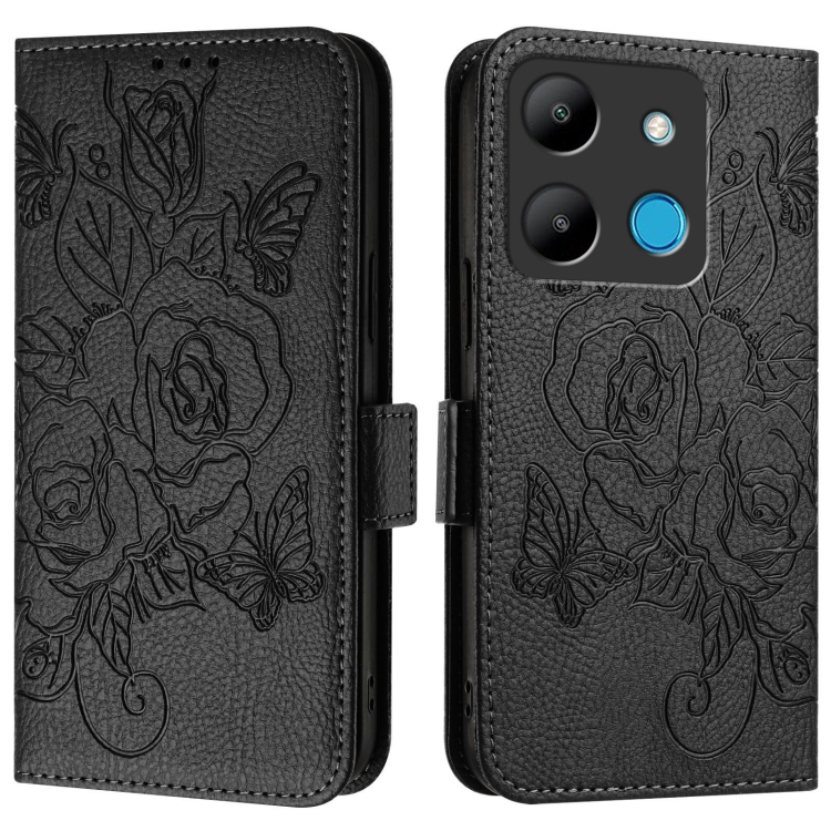 Funda de Cuero Antirrobo RFID para Infinix Smart 7 con Rosa en Relieve (Negro)