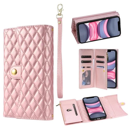 Funda para Teléfono iPhone 11 Cuero Rómbico con Billetera MultiTarjeta y Cremallera (Oro Rosa)