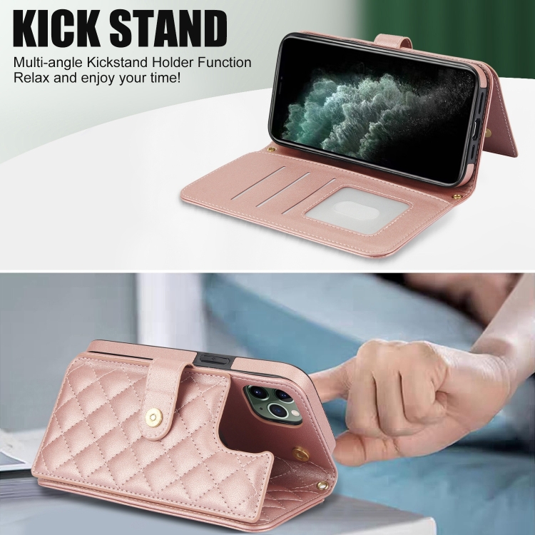Estuche para Teléfono iPhone 11 Pro Max Crossbody Cuero Rómbico Multifunción (Oro Rosa)