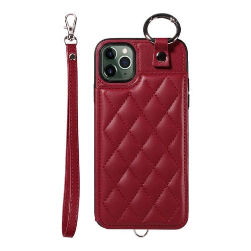Estuche para Teléfono iPhone 11 Pro Max con Bolsa para Tarjetas Textura Rómbica y Cordón Corto (Rojo Vino)