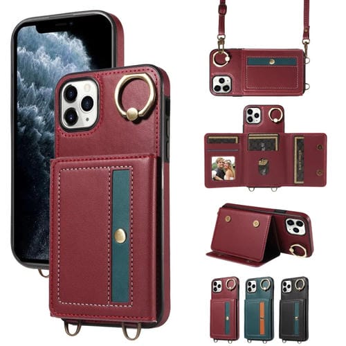 Funda para iPhone 11 Pro Max Cuero con Soporte para Anillo y Bolso Cruzado para Tarjetas (Rojo)