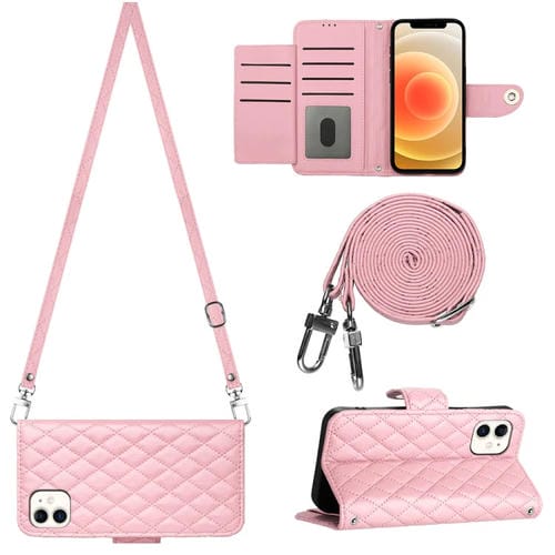 Funda para Teléfono iPhone 12/12 Pro Cuero Textura Rómbica con Tapa y Cordón Largo (Rosa)