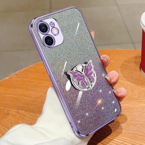 Funda para Teléfono TPU para iPhone 12 con Soporte de Mariposa y Brillo Degradado (Púrpura)