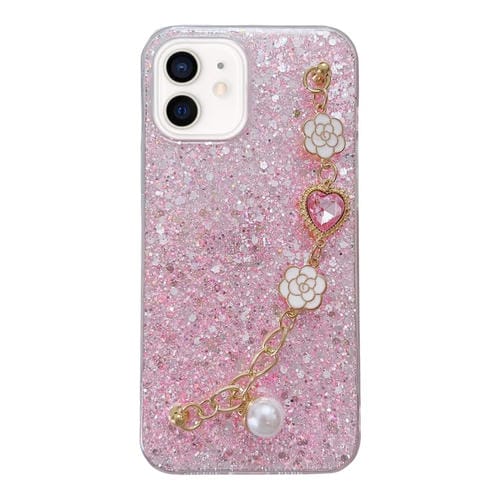 Caja de teléfono TPU Epoxi para iPhone 12 Mini con cadena de gemas de amor y Lentejuelas estrelladas (Rosa)