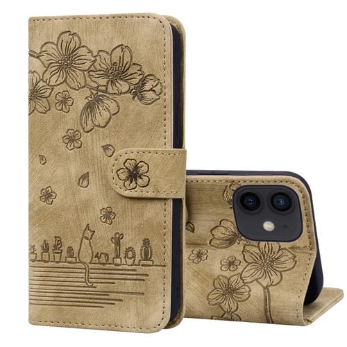 Estuche para iPhone 12 Mini Cartoon Sakura Cat de Cuero en Relieve (Marrón)