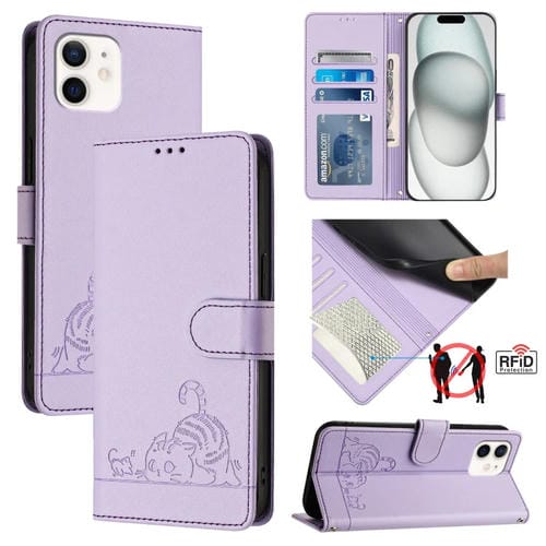 Funda para Teléfono iPhone 12 Mini Cat Rat Cuero Rfid Patrón En Relieve Cordón (Púrpura)