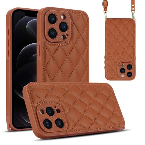 Estuche para Teléfono iPhone 12 Pro Textura Rómbica y Cordón Doble (Marrón)