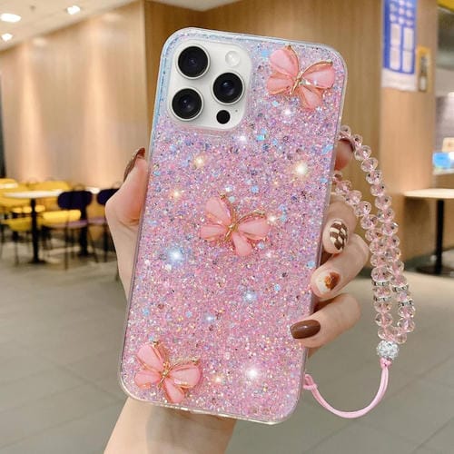 Funda para Teléfono TPU Epoxi iPhone 12 Pro Mariposa de Jade Lentejuelas Estrelladas con Correa (Rosa)