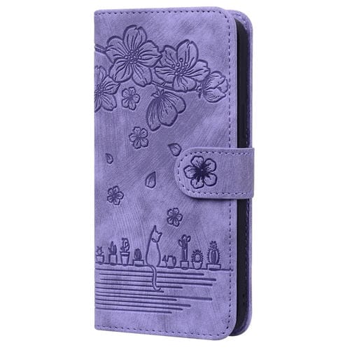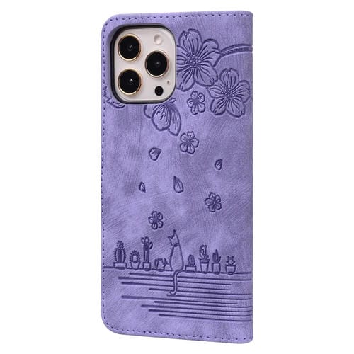 Estuche de Cuero para iPhone 12 Pro Max Cartoon Sakura Cat En Relieve (Púrpura)