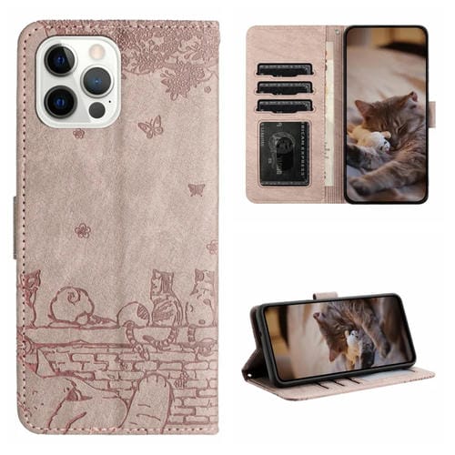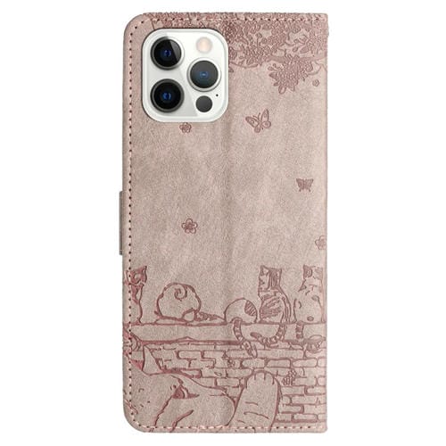 Estuche para teléfono iPhone 12 Pro Max Cat cuero patrón relieve con cordón (Gris)