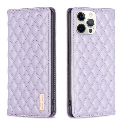 Funda de teléfono iPhone 12 Pro Max Diamond Lattice con tapa de cuero magnético (Púrpura)
