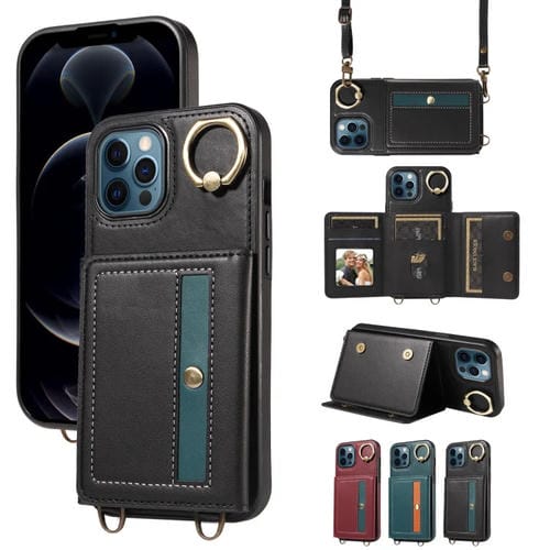 Funda para Teléfono iPhone 12 Pro Max Cuero con Soporte para Anillo y Bolso Cruzado para Tarjetas (Negro)