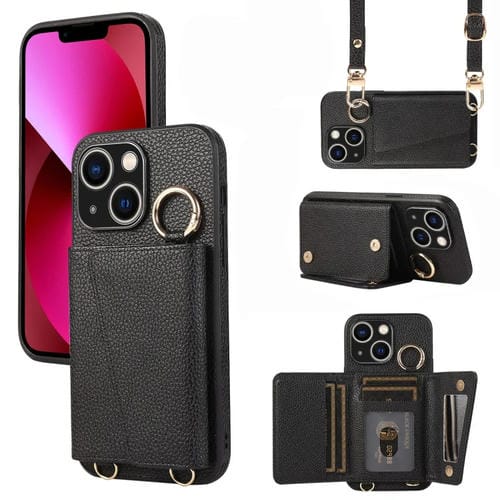 Funda para Teléfono iPhone 13 Contraportada de Cuero con Billetera y Anillo Cruzado (Negro)